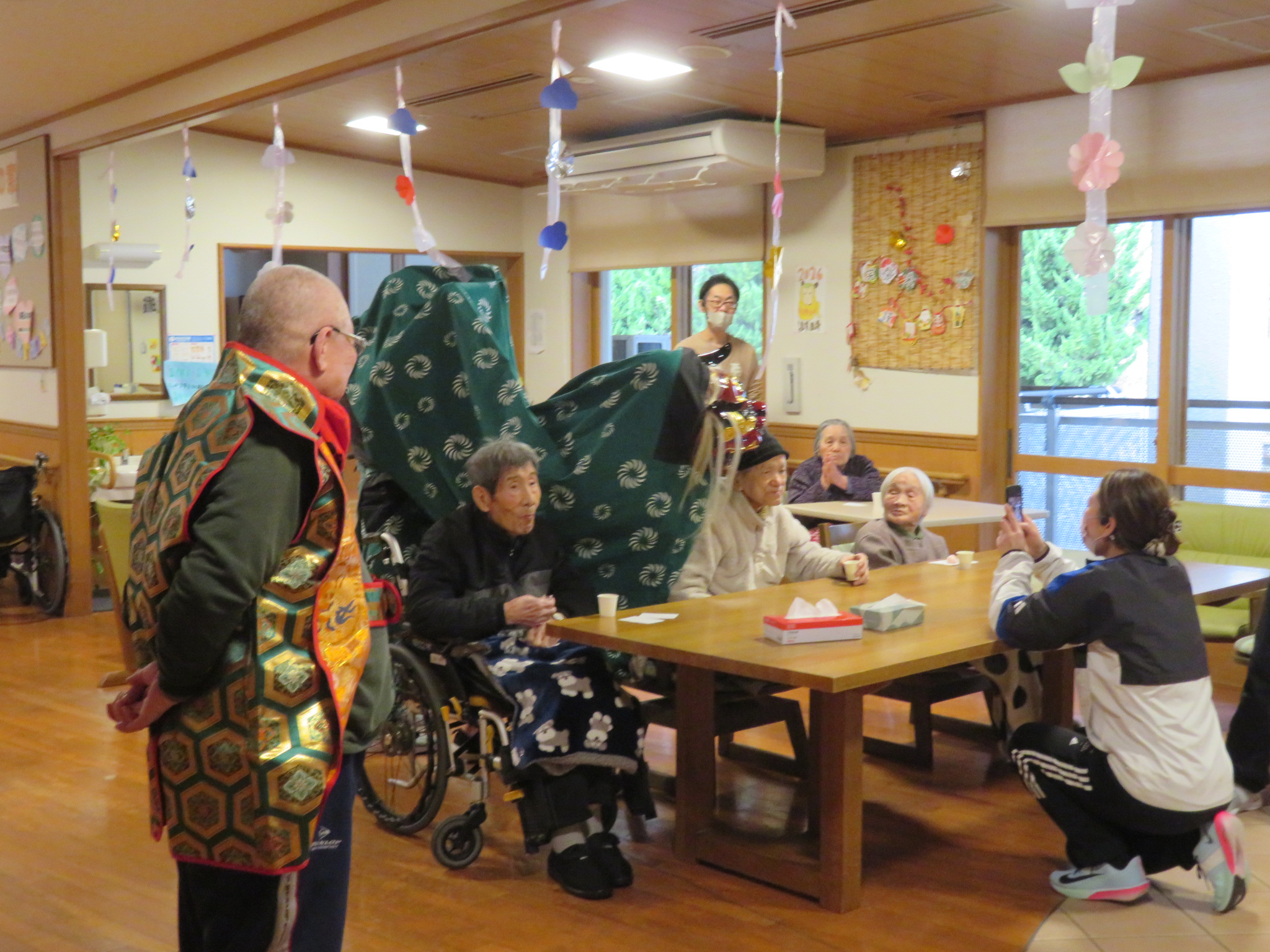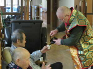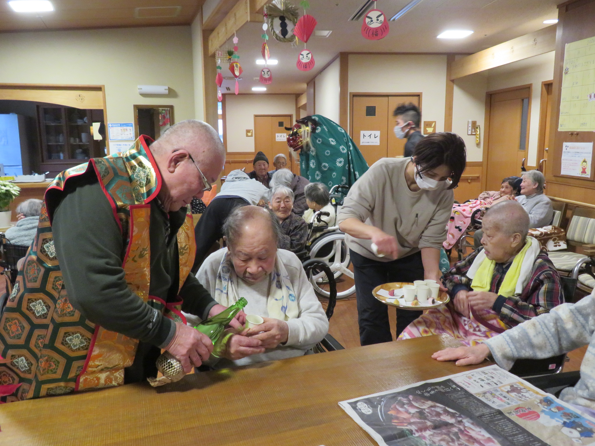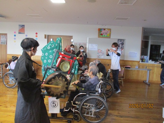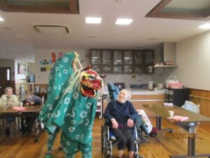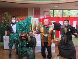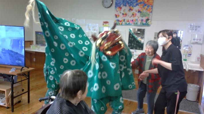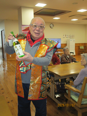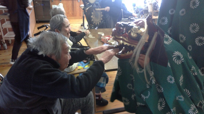 昨日は本部施設で実施した獅子舞とお屠蘇の会を、和合の施設で実施しました。本部施設には『お祭り男』が何人もいるので安心して企画に参加して、本物のお酒を振る舞う事と入居者さんへの新年のご挨拶をする事に徹すれば良いのですが、「果たして和合の施設では、どんな展開になることやら」と予測不能な状況があったのですが『案ずるより産むがやすし』で、入居者さんの喜び方は尋常では無かったです。