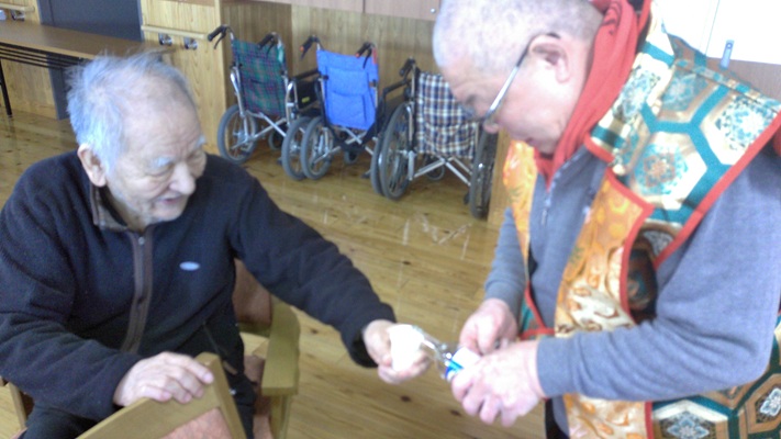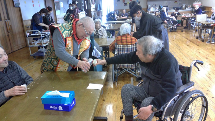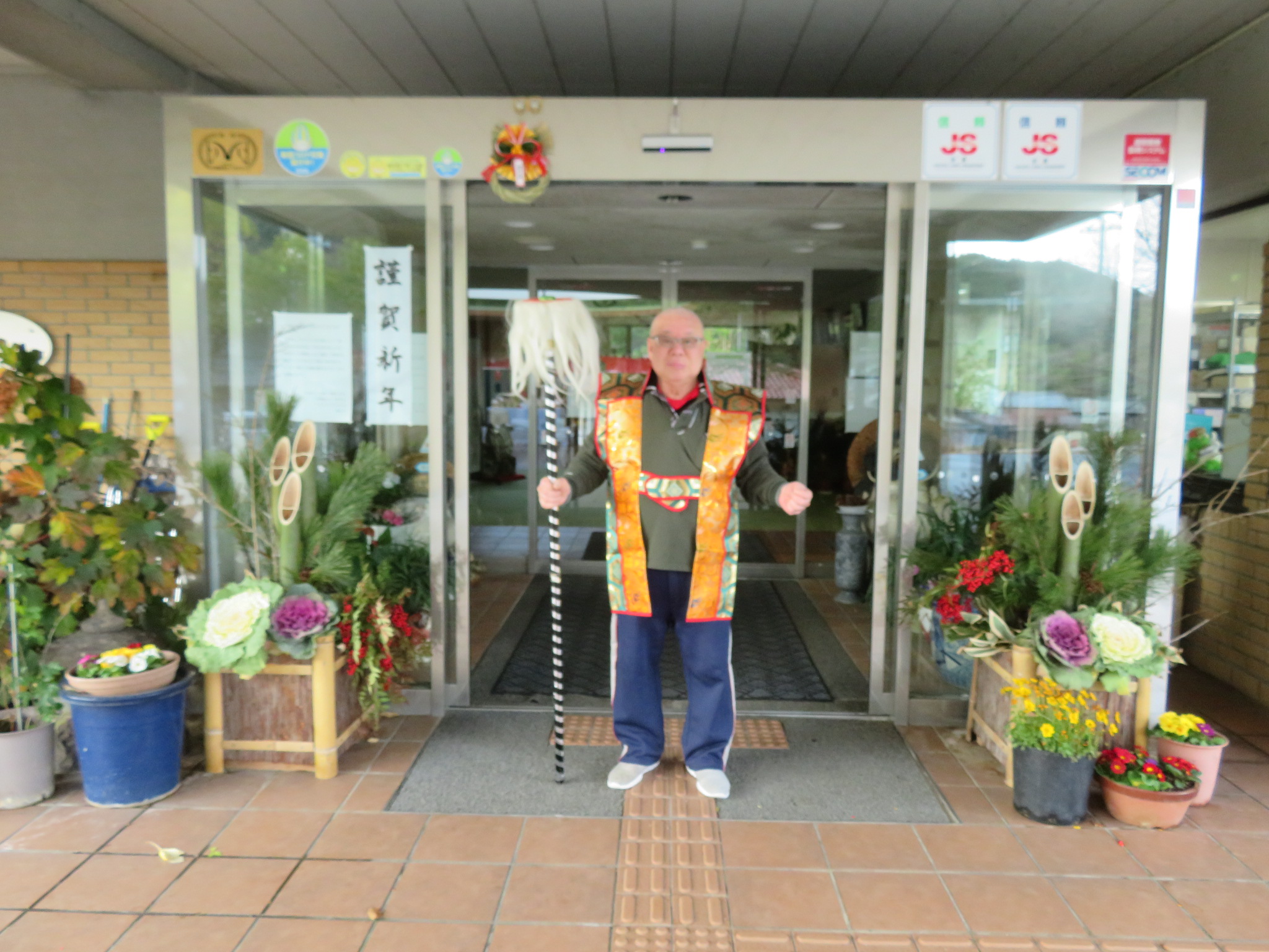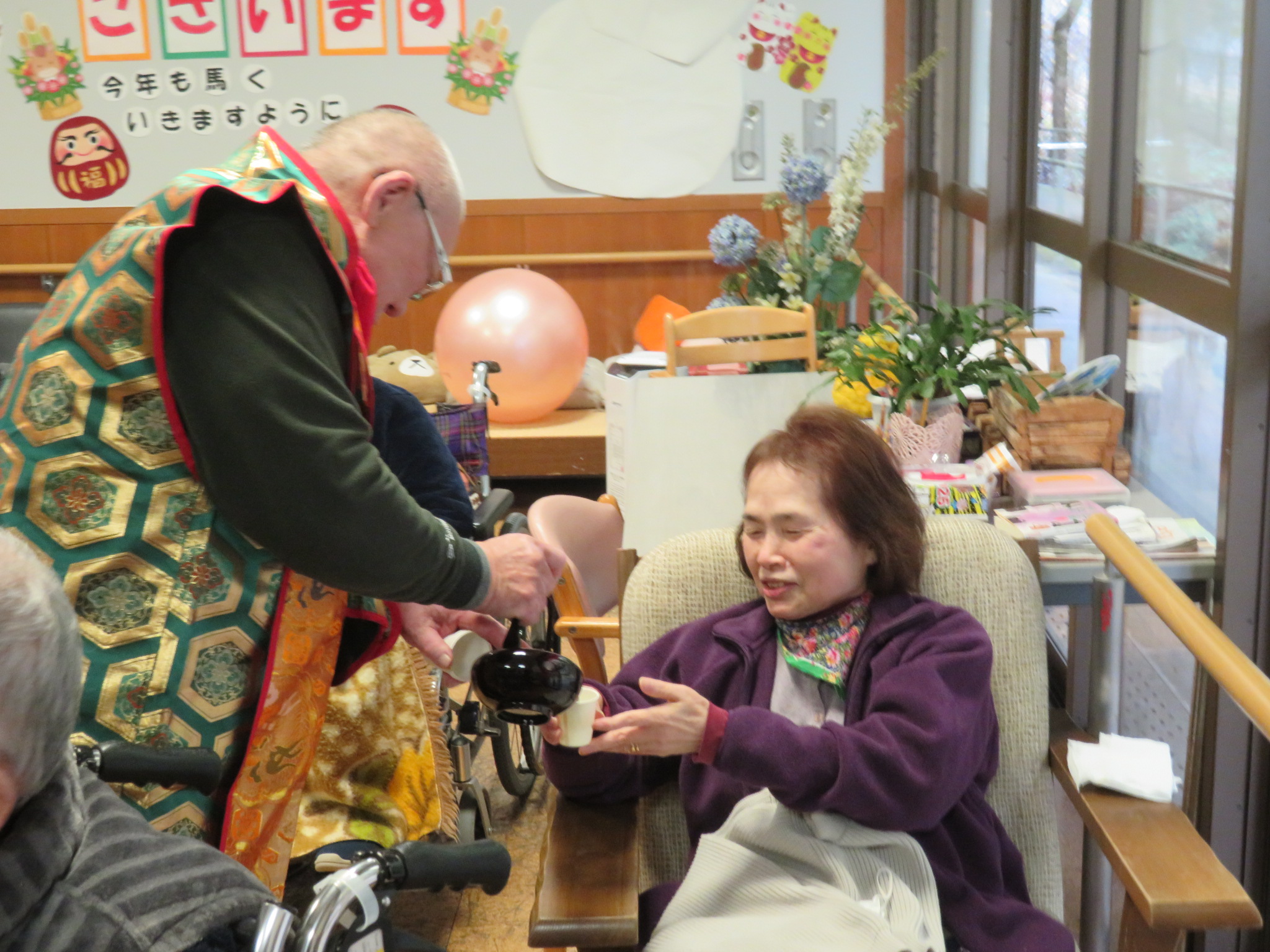 昨日は本部施設で実施した獅子舞とお屠蘇の会を、和合の施設で実施しました。本部施設には『お祭り男』が何人もいるので安心して企画に参加して、本物のお酒を振る舞う事と入居者さんへの新年のご挨拶をする事に徹すれば良いのですが、「果たして和合の施設では、どんな展開になることやら」と予測不能な状況があったのですが『案ずるより産むがやすし』で、入居者さんの喜び方は尋常では無かったです。