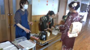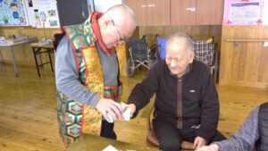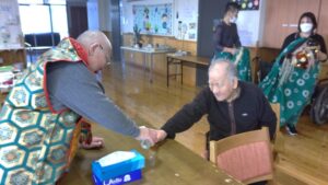 藤本主任が和服を着ての抹茶のお手間をする気合の入れようで、1階から順次2階、3階で獅子舞と共に実施しました。1階のフロアのみ本物のお酒(石川県老施協の南副会長からの頂きもの)を振る舞う事になっていて、私的にはやや不満だったのですが、結果的には2階も3階もノンアルコールの日本酒(月桂冠)で大盛り上がりでした。1階では「とっておきのお酒です。」と言って「お正月だからしっかり飲める方は飲んで下さい。」と言って振る舞うと共に、北島部長の鐘と太鼓で盛り上げると共に、入居者さんの頭を獅子が「ガブっ」と嚙んでもまた大盛り上がり。この勢いの中2階、3階の元酒豪の面々にはノンアルコールと言う事もあり、しっかりと「お正月だし一杯飲んで下さい」と言ってしっかり飲んで頂きました。