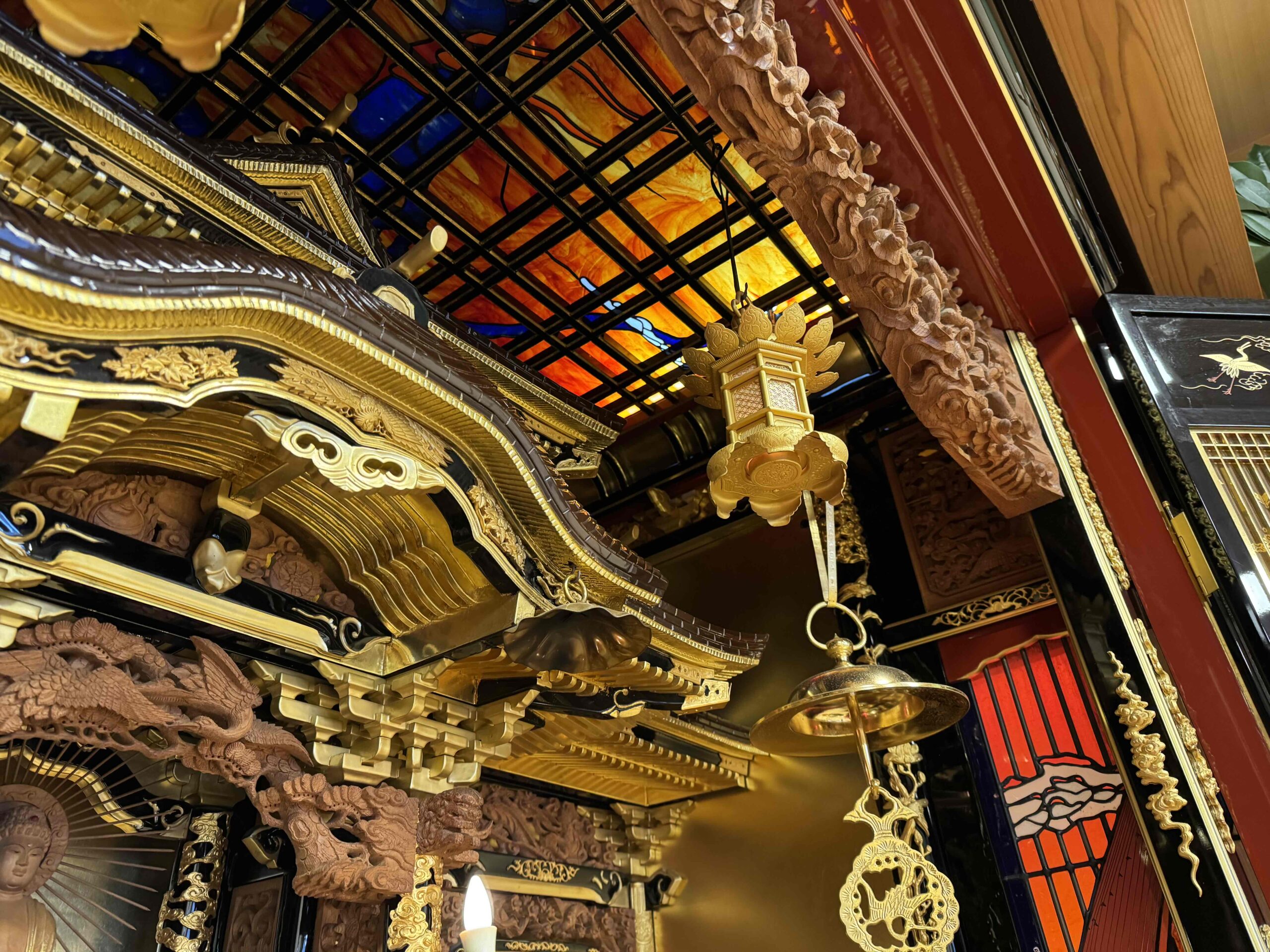 ③施設の中心に祈りのエリアを作る。と言う事で、デイサービスの静養室に1軒半のスペースに三方開きの仏壇を設置して、しかも仏壇の中に天井と両サイドにステンドグラスをはめ込み、ステンドグラスが浮き出る様に蛍光灯の光が差し込む様に特注で依頼しました。(※依頼先は滋賀県長浜市の内藤仏壇店)