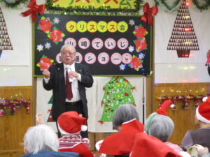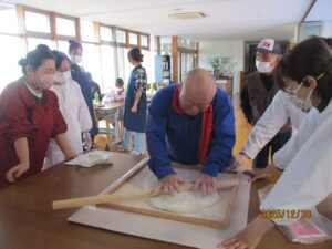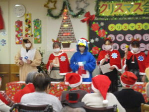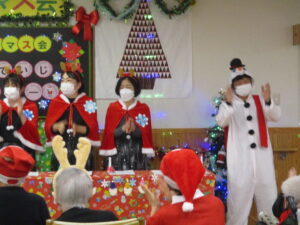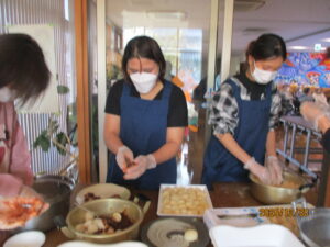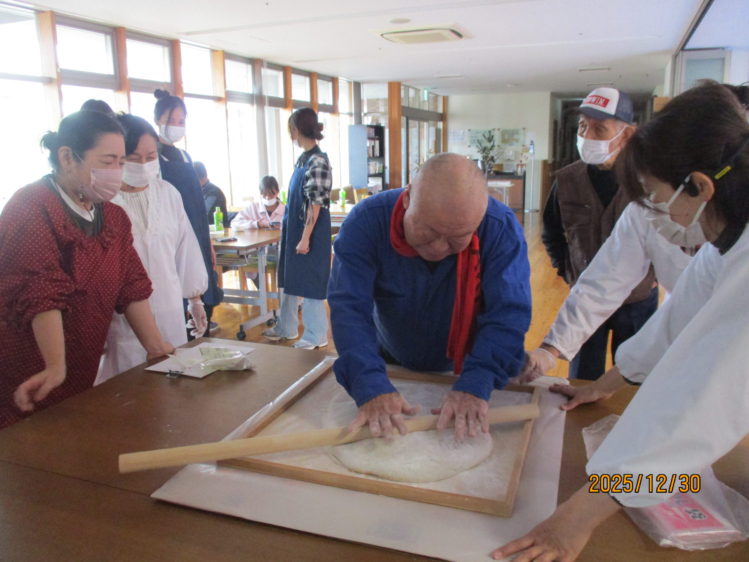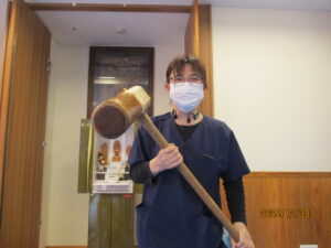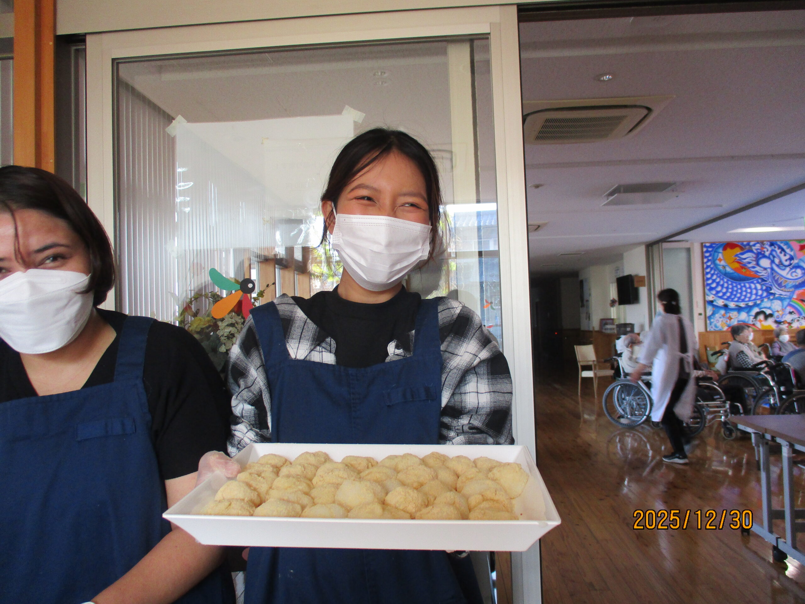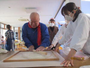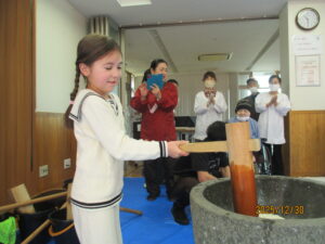 今年の餅つきは休日にも関わらず手伝いを買って出てくれた職員が多くいて、尚且つ子どもを連れて来てくれた職員もいてくれたのは随分雰囲気が変わってきたなと正直感無量でした。勿論、昨年に引き続きてるてる座のメンバーも多く駆けつけてくれました。特に座長は可愛いお孫さんも連れてみえたので入居者さんも喜ばれていました。3臼はちぎり餅にして職員はもちろんの事手伝いに来て下さった方にも満足がいくまで食べて頂き、休みで来てくれた職員とてるてる座のメンバーにはパックに詰めたのを持って帰って貰いました。