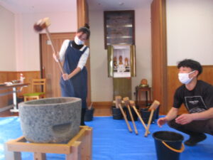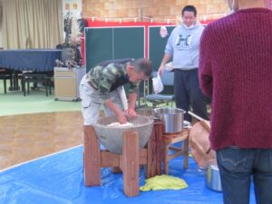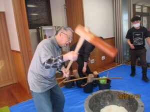 最初は煙がモクモク出たので「北島、邪気を払うのは今だぞ」等と言いながら釜戸の火が燃えるのを楽しんでいて、お湯が沸いた8時50分に蒸篭を2個乗せて蒸し始めました。その時に気が付いたのですが本部施設には蒸篭が5個あるのに和合には2個しかないので来年からはせめて3個になる様に1個は購入したいと思いました。9時35分に蒸し上がりいよいよ餅つきになり、入居者さんも突き手になって下さり和気あいあいにできました。