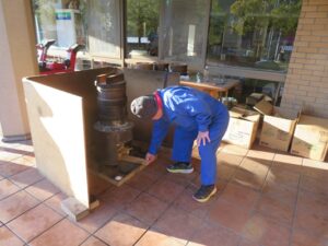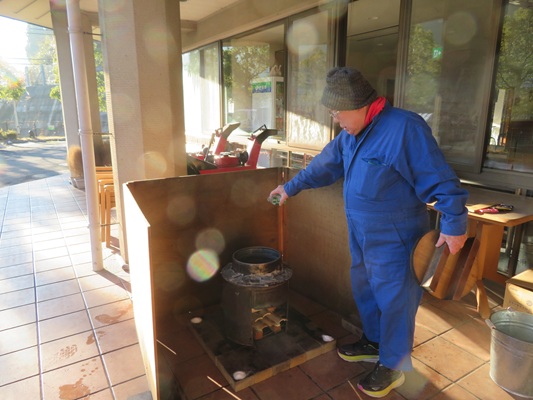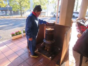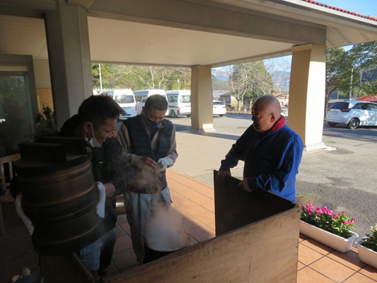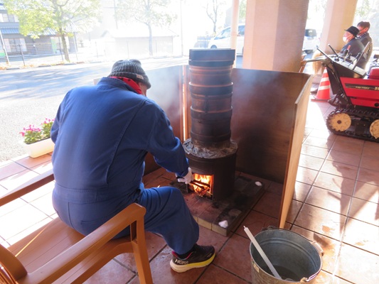 昨日の本部施設での餅つきは8臼だったので結構疲れましたが本日は4臼と昨日の半分の量とは言え何が起きるか分からないと言う事で8時20分には和合の施設に着いたら既に本日は休みの北島部長が全て準備を小栗管理栄養士と共にしてくれていたので、「早速着火式をしよう」と言うと「9時30分から移動が始まるのでもう少し待っていて下さい。」と言うので8時30分になってから、北島部長の協力を得てお酒を振る舞い着火剤を薪に付け釜戸の中に火を点けると薪の井桁が上手く組んであったので勢いよく燃えました。