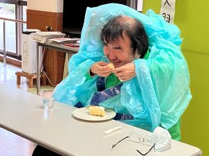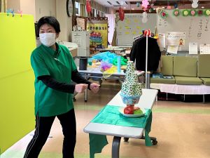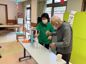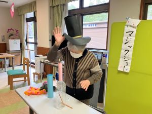 今日は午後からちょっとしたお楽しみ会です。職員のマジックから始まりました。色が変わる水や、いろんなものが出てくる帽子など簡単なマジックでも仕掛けが分からないとどうやっているのか分かりません。笑ったり、驚いたりと皆さんの色々な表情が見られました。