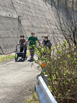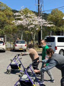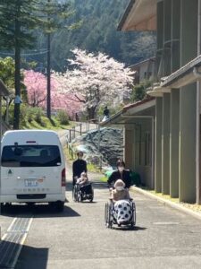 今日のえりかの里 2026.4.3 ようやく今須は満開です 昨日名古屋城へ行かれた職員がいて、もう半分桜が散っていました。と。 ようやく今須は満開となり、 今日は特養が外でお花見ということで、 その前にいくつかのグループに分かれて外へ。 「背中に陽が当たると、日焼けしそうやわ」 と、暖かい一日、最高のお花見日和でした。