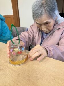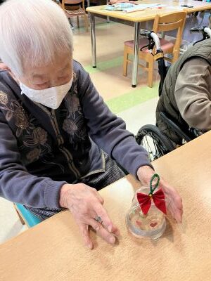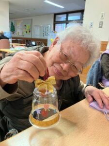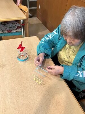 今日のえりかの里 2025.12.3 クリスマスのベルを製作 第2弾 午後からのレクリエーションでは、カラオケ、ゲームのグループ、 更に、クラフト製作のグループでは、 もうすぐクリスマス。 上手に作って、おうちで飾って頂こうシリーズの第2弾 なかなか細かい作業ではありますが、 「キレイに出来上がったで、うちの玄関に飾ります」 と皆さん喜んで持って帰られました。