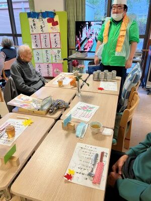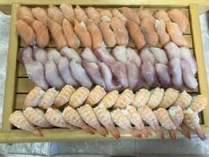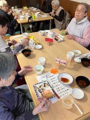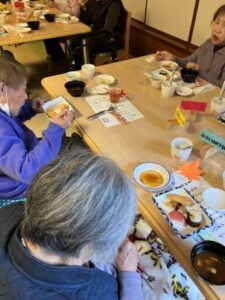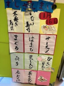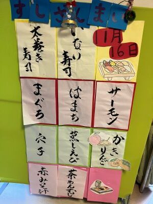 今日のえりかの里 2025.11.16 テーマは「すしざんまい」 今日は、皆さんお待ちかねのバイキング、 テーマは「すしざんまい」 何日も前から楽しみにされている方も多く、ようやく今日が来ました。 ノンアルコールビールで乾杯のあと、 まぐろ、ハマチ、サーモン、えび、あなご、巻き寿司、いなりなど 食べきれないほどのお寿司。 「今年はもうお寿司屋さんへ行かなくてもいいわ」 と皆さんお腹いっぱい、胸いっぱいでした。