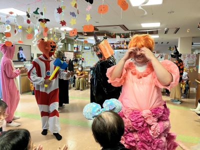 今日は一足早いハロウィンパーティー。先日、皆様と一緒に作成したハロウィンのおばけの衣装を、お好きな物を選んで頂き、着ていただきました。「こうした方がおばけの顔がかわいくみえるでしょ」「どう?似合ってる」皆様楽しそうに来て下さりワクワクと仮装行列の到着を待ちます。