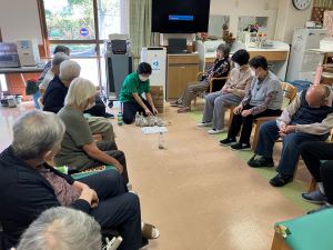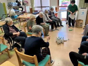 今日のレクはモルックというフィンランドのゲームです。ボーリングに近いゲームですが、ピンになるものには1~12までの点数が書いてあり、チームに別れてピンを倒して50点先取の競い合いを行うものだそうです。