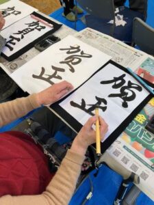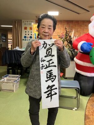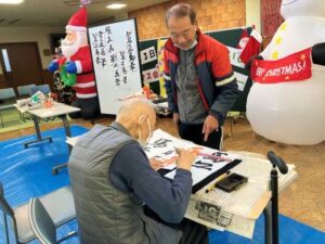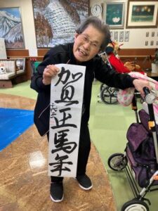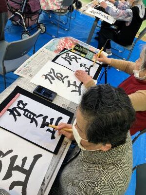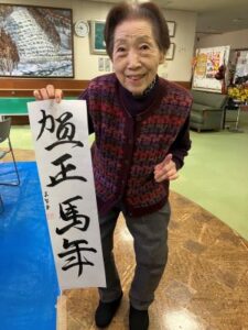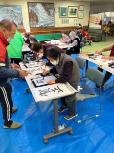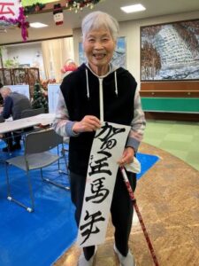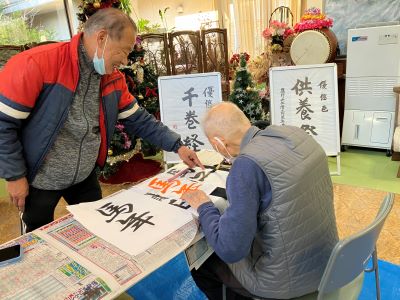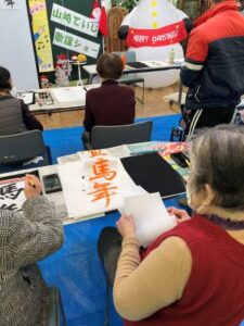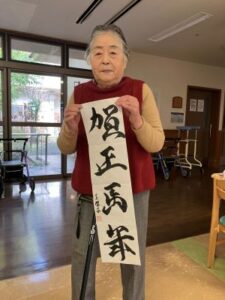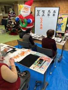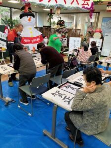 今日のえりかの里 2025.12.16 今年最後の習字の指導を受けながら 今年最後の書画教室。 先生の指導を受けながら、上手に書けるように。 「ちっともキレイに書けないわ」 「先生の言う通りに書いています。」 など、それぞれの方が、筆を持参される方もみえ、 一生懸命。