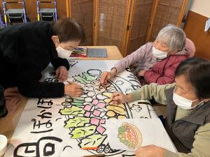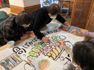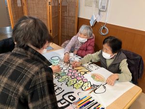 今日のえりかの里 2025.11.28 冬はやっぱり鍋ですね。 もうすぐ12月ですね。12月のバイキングメニューは鍋です。 キムチやトマト、すきやきやおでんもこの季節には美味しいですよね。 今回のバイキングは寄せ鍋です。今日は皆さんにバイキングの壁面飾りを一緒に作成してもらいました。皆さん塗り絵のプロばかりで大きな鍋の絵もあっという間に完成です。絵だけでも美味しそうです。 皆さん来月14日のバイキングお楽しみに♪
