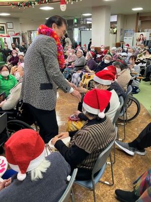 今日のえりかの里 2025.12.23 喜ばれたクリスマス会 今日は皆さん楽しみに待って見えたクリスマス会でした。 山崎ていじ様が登場すると大歓声で、タンバリンを鳴らしたり団扇を振ったりそれぞれ喜びを表現されていました。利用者様のアンコール曲にも答えてもらえて最後まで盛り上がりました。 伊勢街道祭り歌では、今まで練習してきた成果もあり、一緒に踊り楽しいひと時を過ごされました。
