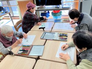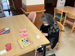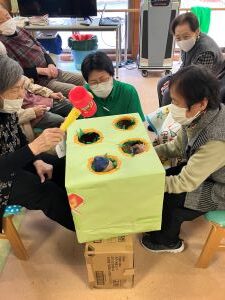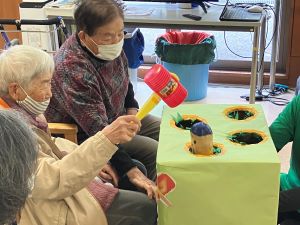 今日のえりかの里 2026.3.10 寒くても春はすぐそこ 今日も天気が良く春らしい日差しがみられましたが、風が強く気温は冬並みでしたね。春が待ち遠しいです。 今日は皆さんと一緒に春の壁面作りです。花を作成して頂いたり、塗り絵も春にちなんだものを塗って頂きました。 午後からのレクはモグラ叩きです。春といえば、キレイな桜や花、そしてモグラと…皆さん叩かれないように、また、叩けるように工夫しながら白熱のモグラ叩きになりました。
