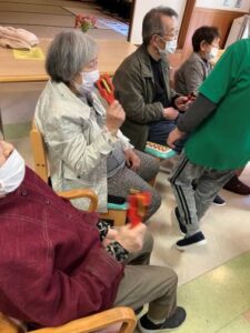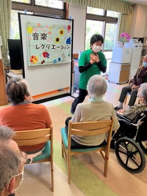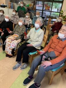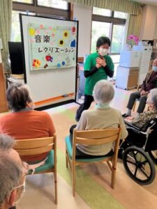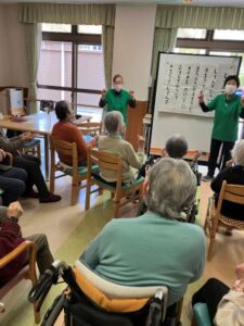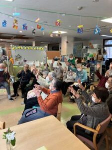 今日のえりかの里 2026.4.25 懐かしい歌を組み合わせて 今日は音楽レクリエーションを。 桐山cwの先導、司会に利用者みんなで参加。 懐かしい歌、「高原列車は行く」など歌いながら、 また、クイズと共に、楽器を使って体を動かしながら、 生き生きと皆さん楽しまれていました。