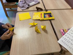 今日はも寒い日になりました。手や指先が思うように動かない事も出てきますね。皆さん今日は折り鶴、塗り絵、ポップコーン演奏で手先を動かして過ごされました。