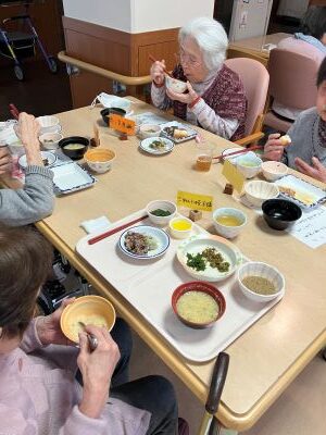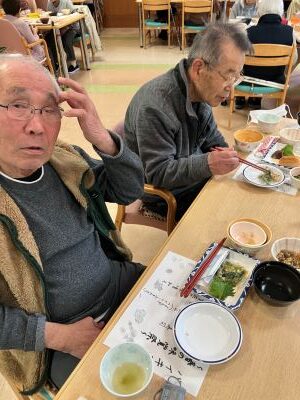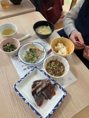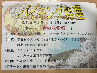 今日のえりかの里 2026.3.30 春の味覚いっぱいのバイキング 今日は、曇りがちではあったものの、暖かい一日。 皆さんがお待ちかねの「春の味覚祭」のバイキング。 つくし、ふきのとう、ヨモギの天ぷらに、 カツオのたたきやちらし寿司などなど、 桜咲くこの季節ならではのバイキング。 「お腹いっぱいで、もう食べれません。」そんな利用者もみえ、 「夕飯は控えめにします」などなど 今年度最後のバイキング、お腹いっぱい、胸いっぱいで楽しんで頂きました。
