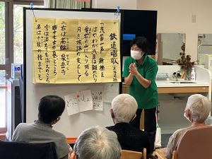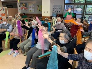 今日のえりかの里 2025.10.10 楽しい音楽レクリエーション 今日 10月10日は目の日 目にちなんだ歌「上り目 下がり目」から始まりました。目は大切な機能の一つ大切にしたいものですね。 高原列車に合わせてスカーフを使って生き生きと体操をしました。皆さん5歳10歳くらい若返ったのではないでしょうか?運動するにも良い季節となりました。 汽車にちなんだ曲で体操をしたり、リズムに合わせて鳴子を鳴らして楽しいひと時を過ごしました。