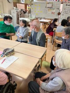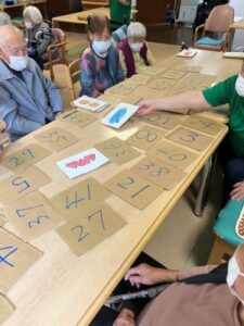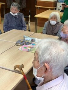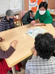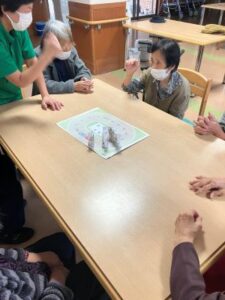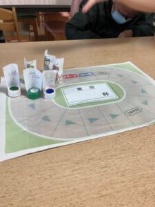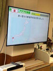 今日のえりかの里 2025.10.14 楽しく、様々なゲームでレクリエーション 今日の午後からのレクリエーションは3種類 絵合わせ、競馬ジャンケン、都道府県クイズ。 利用者にそれぞれに選んで頂いて、 「こんなに大きい絵なのに、なかなか難しいもんやなー」 名物や、名所のヒントを言いながらのクイズ。馴染みのある県は答えられるけど。 ちょっとマスが小さめでごめんなさい。 それぞれで、ワイワイ賑やかに楽しんで頂きました。
