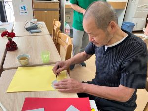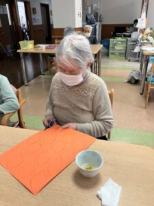 今日の午前中は、秋飾りを利用者様と一緒に作成しました。秋らしい赤や黄色の画用紙を紅葉や銀杏の形に切っていきます。たくさんお願いしましたが、皆さんのご協力で完成出来ました。