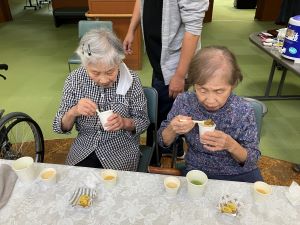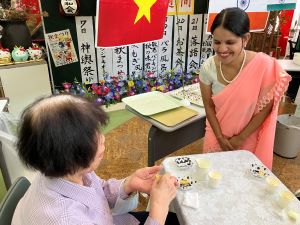午後からは敬老週間のイベントで、インドネシア、ネパール、インド、ベトナムから来た職員の母国のお菓子を作ってもらい皆さんに振舞ってもらえました。