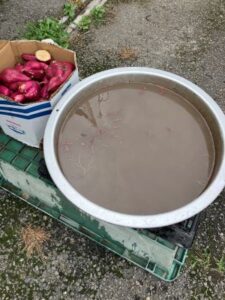 焼き芋用に使う、収穫したサツマイモを利用者と一緒に洗いました。
