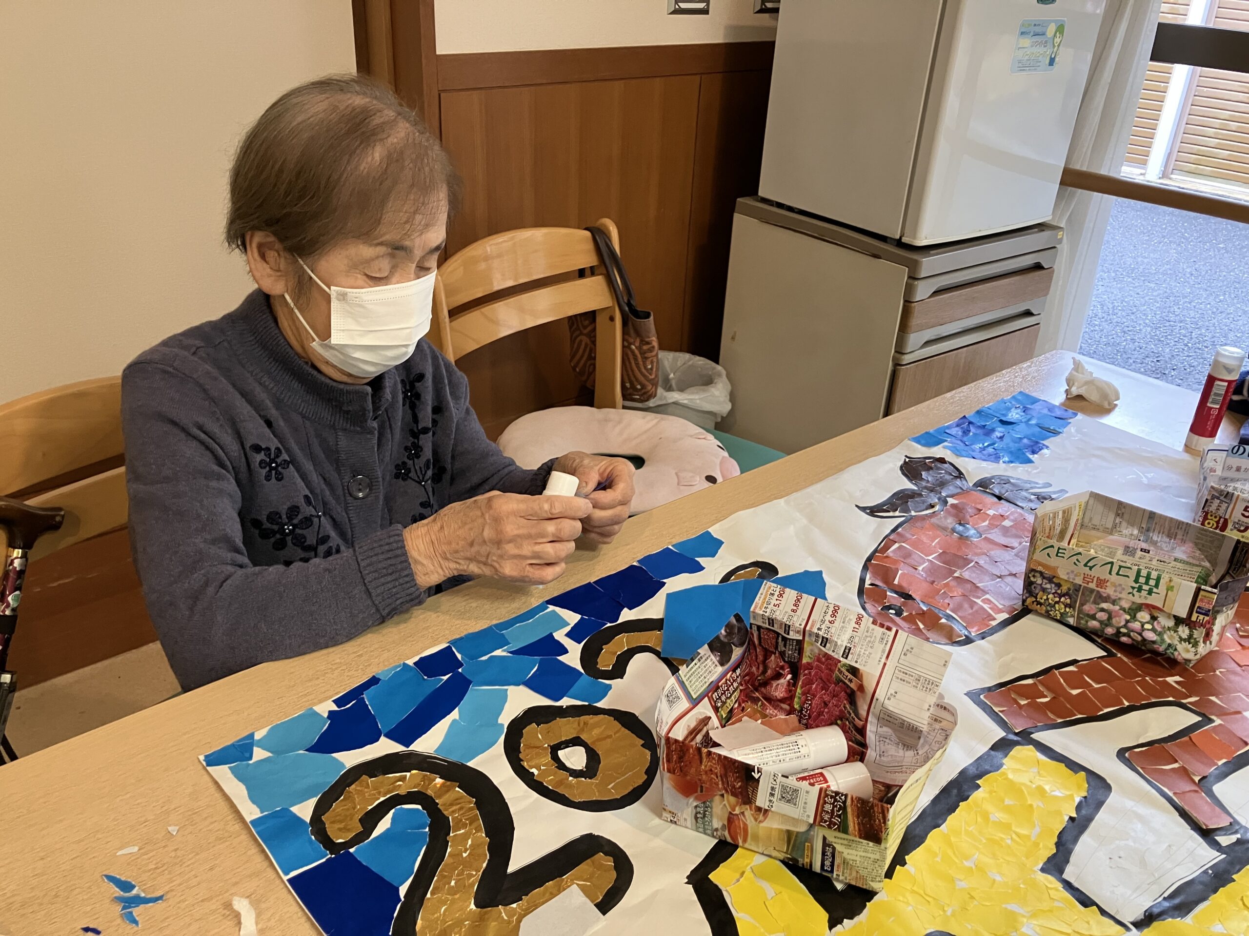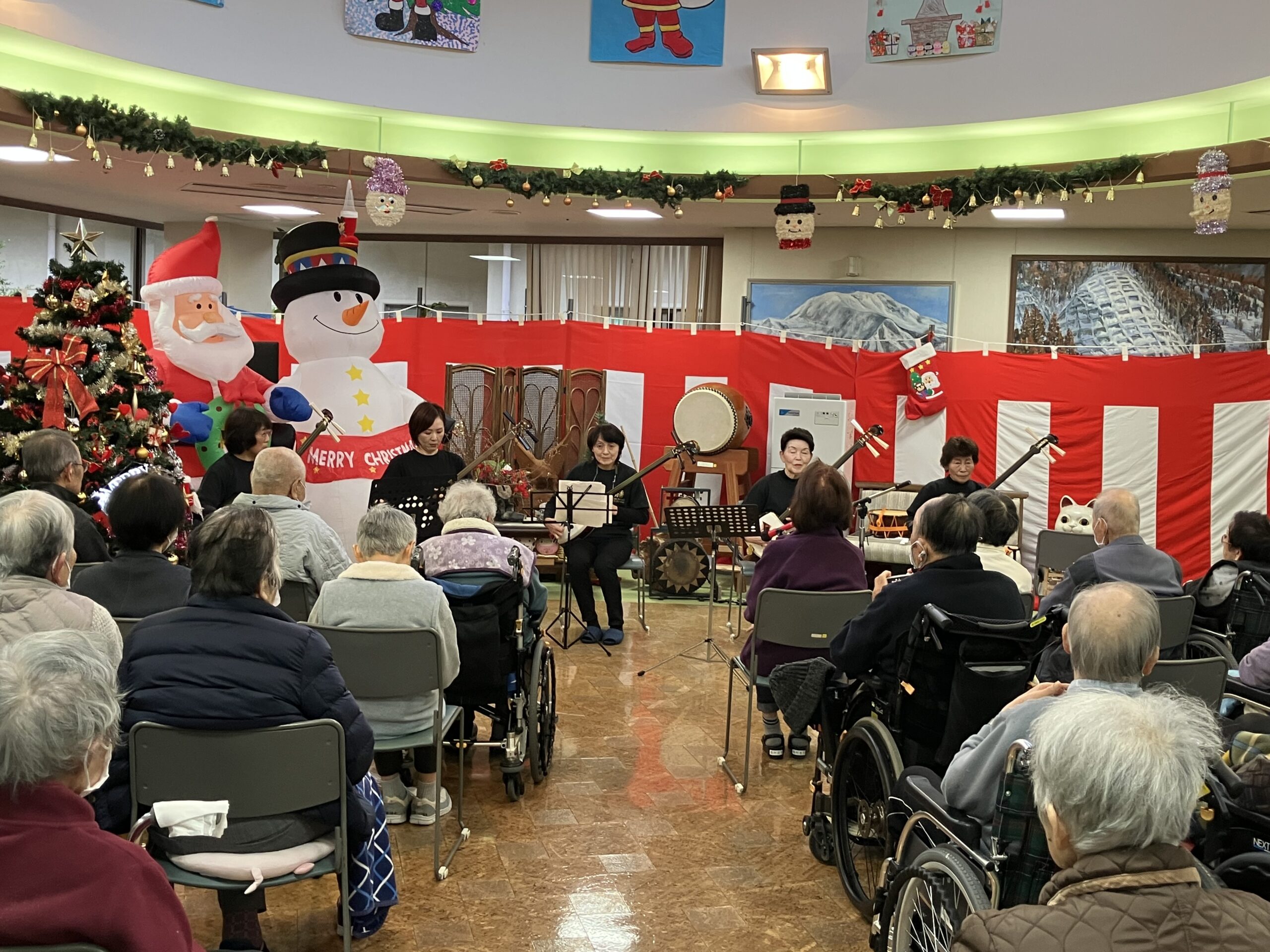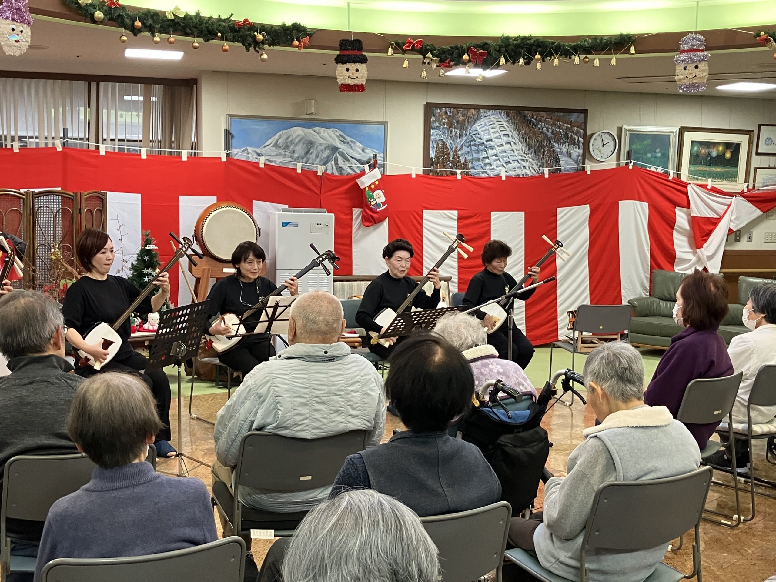 今日のえりかの里 2025.12.24 行事盛り沢山な日が続いています 昨日のクリスマス会に続き、今日は関ケ原三味線クラブの方々が訪問され赤鼻のトナカイや、お正月の歌を披露して下さいました。 他にも「何は節だよ人生は」「星影のワルツ」などなじみのある曲も披露して下さり一緒に歌を歌い楽しいひと時を過ごしました。 デイサービスでも、お正月飾りを作って新年の準備をはじめています。