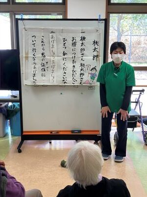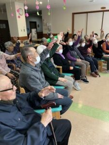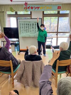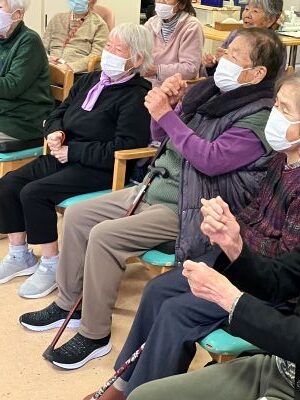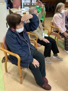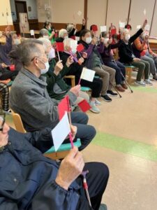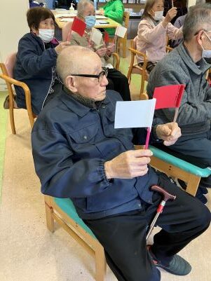今日のえりかの里 2026.2.28 赤上げて、白上げないで、赤下げて 今日は、職員の桐山cwによる音楽レクリエーション。 毎回思考を変えて、楽しく音楽に合わせて、身体を動かします。 「赤上げて、白上げないで、赤下げて」や、 懐かしい童謡を織り交ぜながら、楽しいレクリエーションでした。