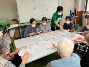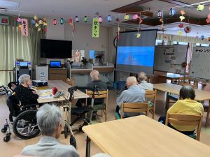 映画とは別に秋の味覚狩りという季節がらのゲームも行いました。果物を取りながら裏に書かれているお題に答えます。紅葉の名所は何処?等の問題があり、昔紅葉狩りに行った所を思いだしながら楽しまれてみえました。