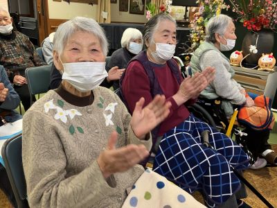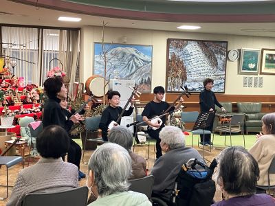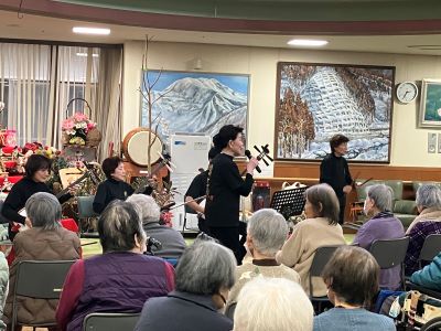 今日のえりかの里 2026.2.25 響き渡る三味線の音色 今日は、2か月に一度の三味線クラブの来苑 伝統の三味線。いつ聴いても迫力あり、響き渡ります。 地元の若手の青年も参加。かなりの腕前に皆さんもビックリでした。