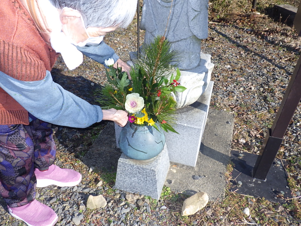 今日の優・悠・邑 和 2025.12.29 お地蔵様もお正月仕様 も~いーくつ寝るとお~正~月~♬ 今日はお天気も良く暖かいのでお地蔵様のお花を変えてもらいました。 お正月仕様のお花を活けてもらいました。 利用者様のお部屋にもお正月飾りが付きました。 今年も後少し、良い年末を迎えましょう。