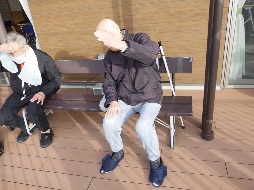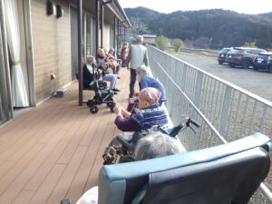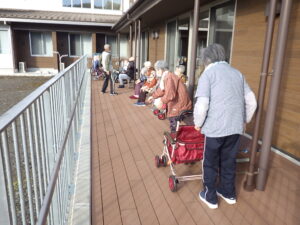 ラジオ体操のあとベランダで朝の散歩をしました。入所者様同士の交流もありました。
