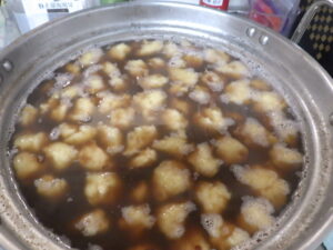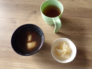 小麦粉に味付けをしておもちににたて丸くしました。大根の漬物も添えました。茶話会にはお話