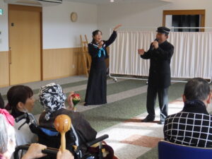 今日の優・悠・邑 和 2026.2.9 とても楽しかったです! 今日は2ヶ月に一度開催される『てるてる座』の観劇日です。 入所様がとても楽しみにされてみえ、曲に合わせて手拍子したり一緒に歌ったりと 気分上々最高の笑顔です。 てるてる座の皆さん、毎回衣装の準備や選曲や踊りなど大変だと思いますけど 入居者様皆楽しみにしてますので又次回もよろしくお願い致します。 本当にありがとうございました。 お疲れ様でした。