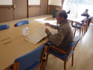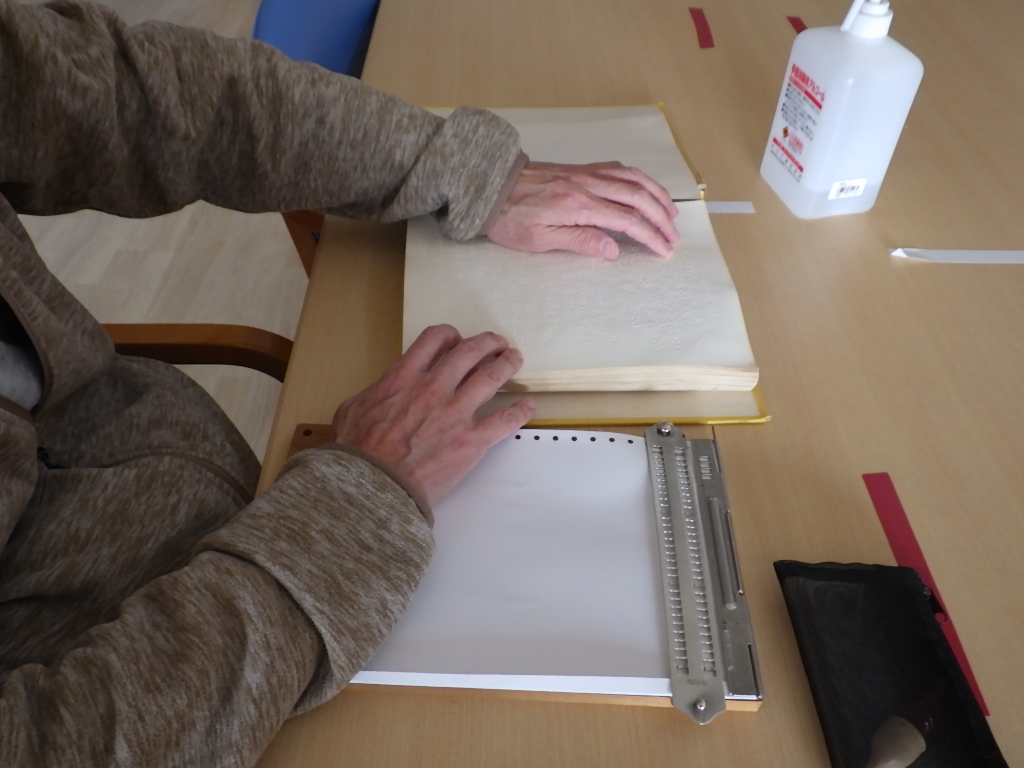 左手で読み、右手で点字を打ちます。今日は演歌本を写されています。そして日曜日のカラオケに臨まれます。1時間以上集中されていました。