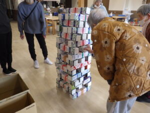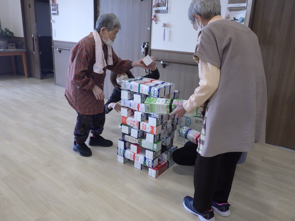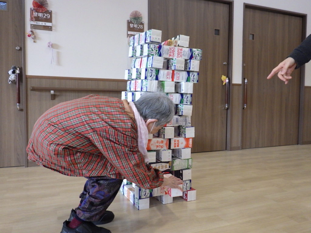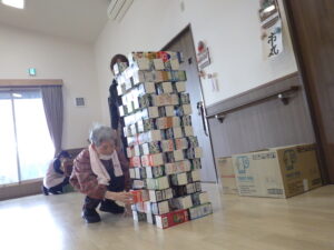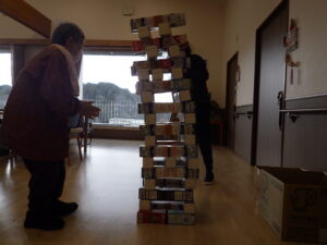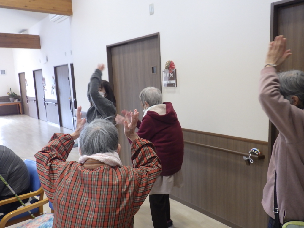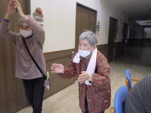 コグニサイズという2つ同時のことをしながら行う運動です。歩きながら手を叩く、手を上に挙げるという動作を行いながらフロアの中を歩きました。