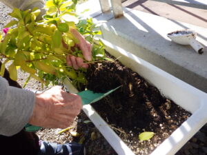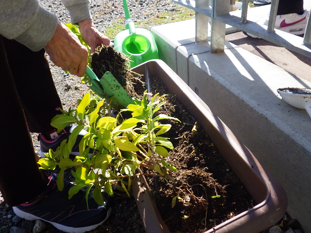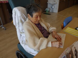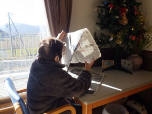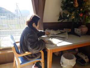 今日の優・悠・邑 和 2025.11.29 ひだまりで手仕事 暖かいお日様にあたりながら日向ぼっこだけするにはもったいないと新聞でゴミ箱を作って下さいました。 お日様をいっぱい浴びてわけぎの苗が元気です。 日日草のお花が終わったので次は葉牡丹を植えます。 そろそろお正月の準備ですね。 来月105歳のお誕生日を迎えられるK様 毎日日記をつけられます。 とても意欲的で元気をもらいます。