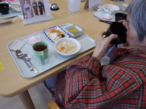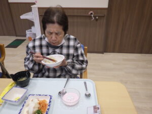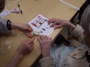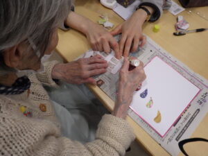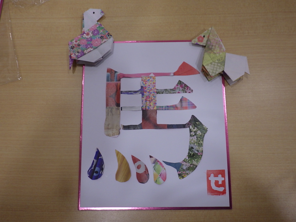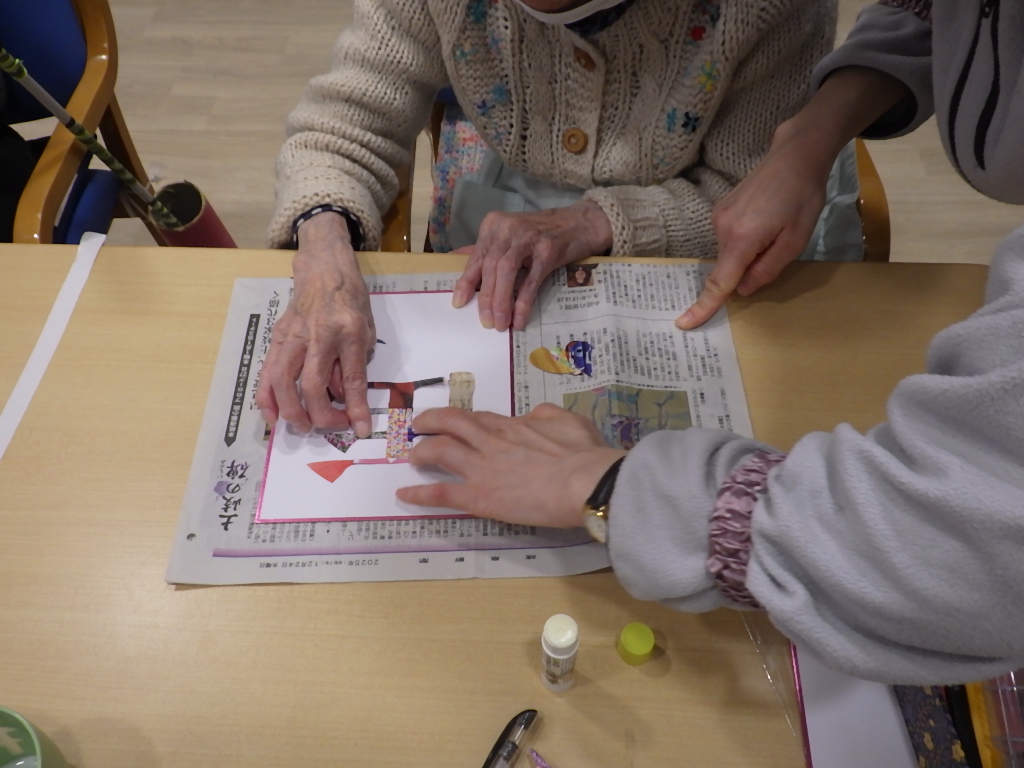 今日の優・悠・邑 和 2025.12.25 クリスマスとコラージュの作品作り 今日はクリスマスですが、外はあいにくの雨模様です 昼食はクリスマスメニューです バターライスやキッシュ風オムレツ、デザートまでいつもと違うメニューに、皆さん 「美味しいね」と喜んで口にされていました お腹いっぱいになりましたか? こちらは馬の字のコラージュです。いらない雑誌を切り抜いて組み合わせ、台紙に貼りました 折紙で折った馬と落款を押せば完成です きれいな作品が出来あがりましたね 来年もいろいろな作品に取り組めるといいですね