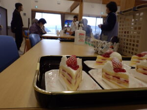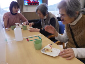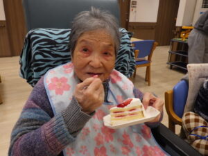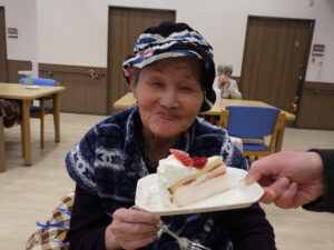 視覚障害のある方にとってケーキは食べにくい食べ物だそうです。うまく食べれる自信のない方には一口サイズにカットしフォークで刺しやすくします。汚れる事を気にせず楽しく食べて頂けました。ケーキの後は施設長とおしゃべり&写真撮影です。
