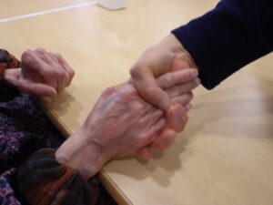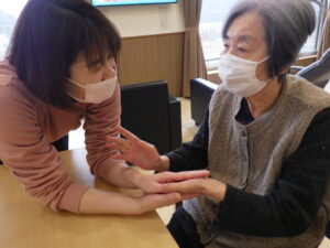 こちらの様子は「この手は誰でしょう」です。職員さんの声は聴き分けられますが手の感触はどうでしょうか・・・結構難しいようで一生懸命悩まれていました。