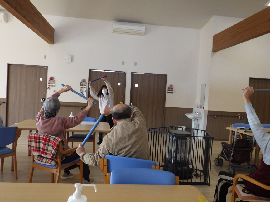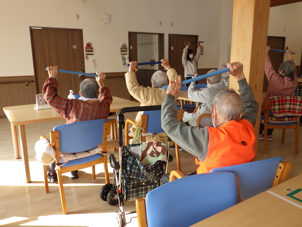 今日の優・悠・邑 和 2025.12.30 今年も頑張りました! 今日は久しぶりの歩行訓練です。 久しぶりですので、15m程でギブアップです。 毎日少しずつ距離を延ばしていきましょうね。 そして午後からは、こちらも久しぶりの棒体操です。 入所様は「肩が軽くなったわ!」と喜ばれていました。 こちらも定期的に行いたいですね。 では、皆様良い年をお迎えください。笑顔で年越ししましょうね!! 来年もよろしくお願いいたします。(^▽^)/
