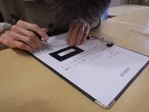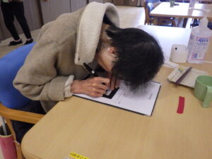 牛乳パックで作成した枠の中にお名前を書いて頂いています。はみ出す心配もなく枠いっぱいにご自身のお名前を書かれていました。代わりに書く事は簡単ですが視覚に障害があっても少しの工夫で出来る事が広がり自身に繋がります。これからも1人1人に寄り添った支援を行っていきます。
