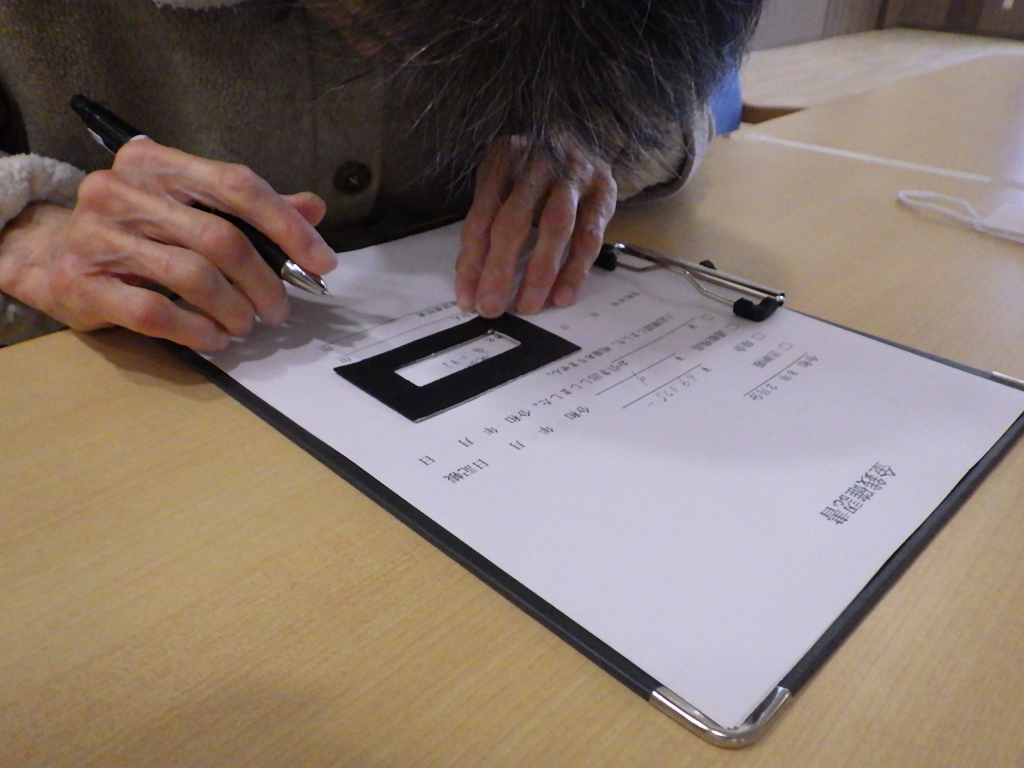 さてこちらの入所者様は視覚に障害がありますが工夫をして自署されている様子です。
