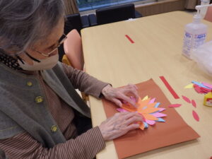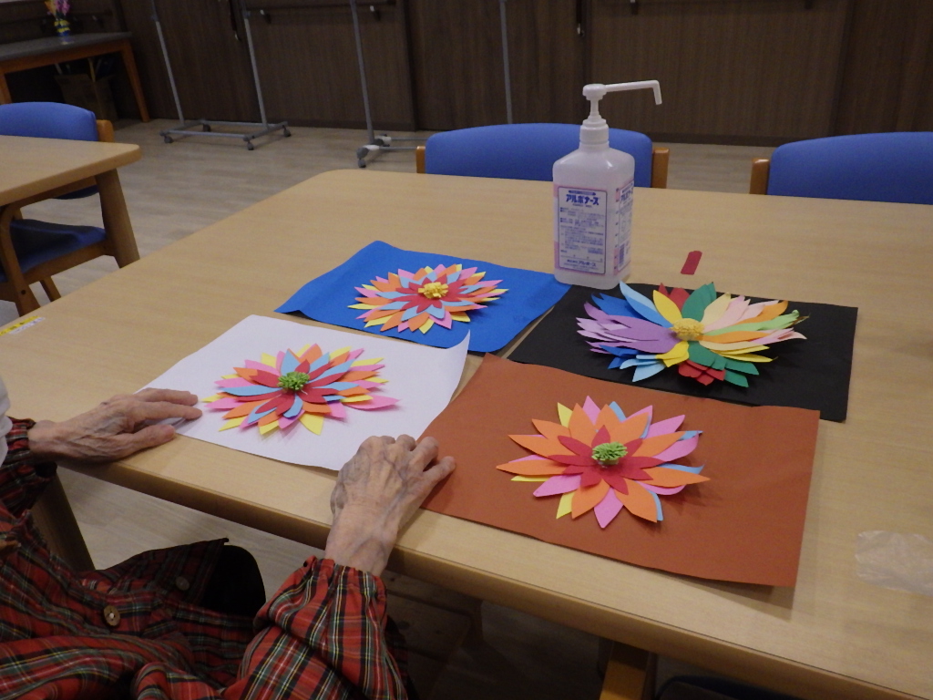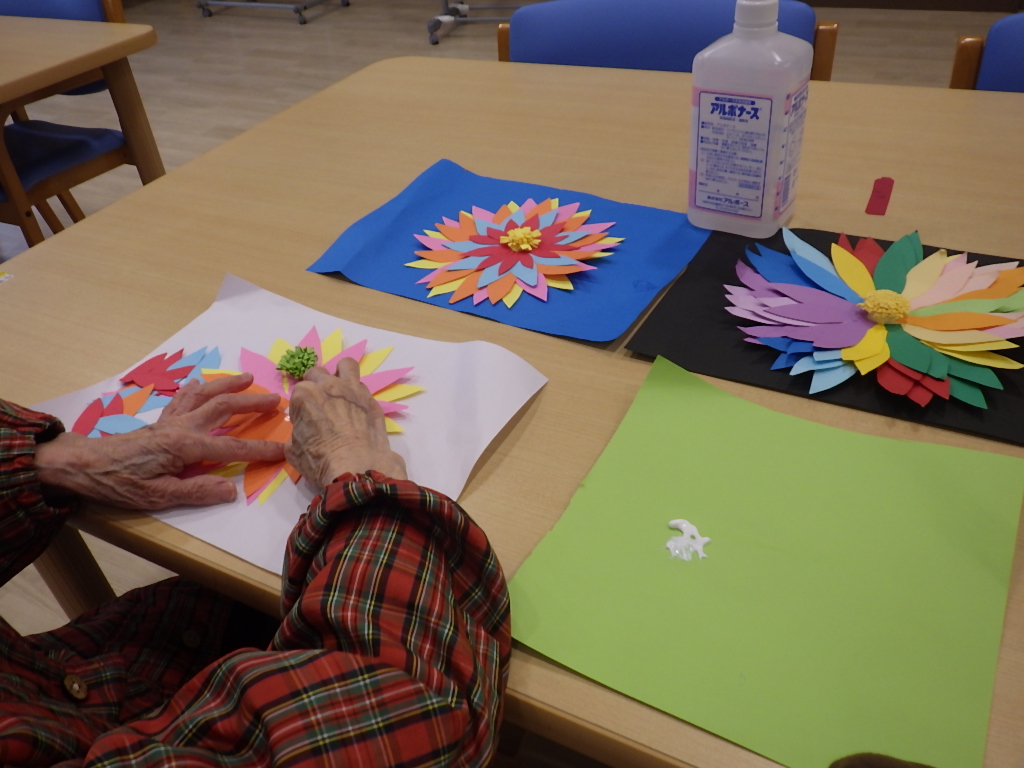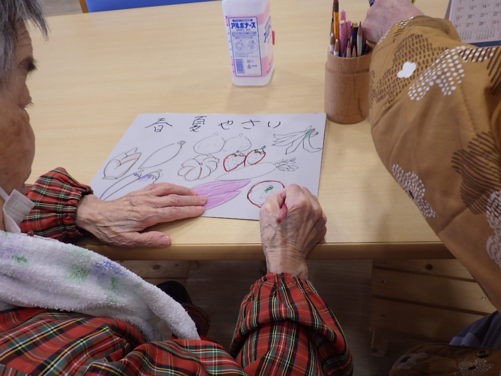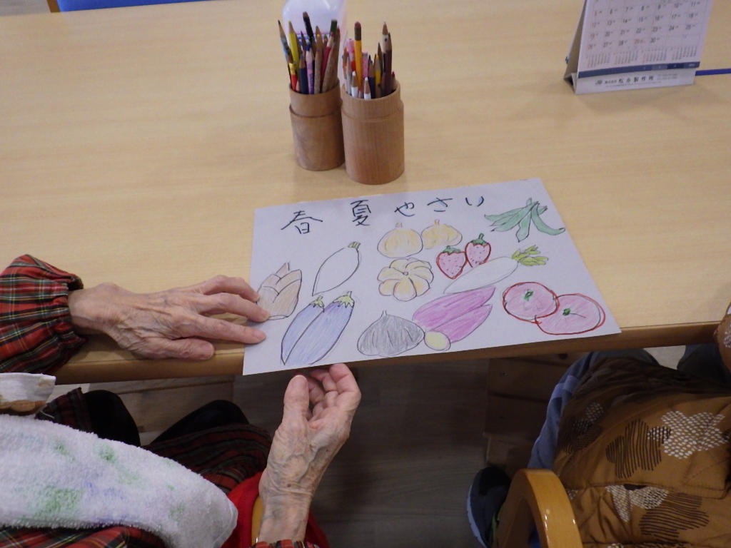 今日の優・悠・邑 和 2026.4.4 今日は雨模様 春、夏野菜の色塗りを楽しそうにしてみえました。 午前中、入居者様と工作として色画用紙を使用して、花びらを貼って頂きました。視覚障害者様はダリアの花びらと言ってみえました。又、出来上がりを指で触れてみえ、きっと美しいですねと言ってみえました。 昼食時、職員からの頂き物花ッコリのお浸しを1品添えて頂きました。皆様美味しく召し上がってみえました。 明日はどんなことがあるか楽しみですね。
