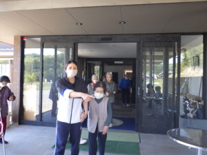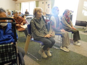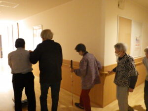 午後からは恒例の避難訓練です。入所者の皆様慣れた様子で玄関まで歩いて来られました。