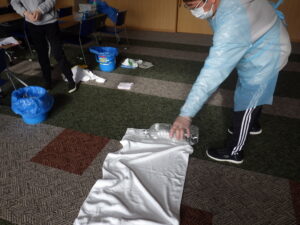 感染を広げないための正しい処理方法のレクチャーを受けます。