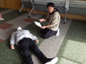 昨年消防署にて教えていただいた一次救命の方法を実践して再度確認しました。