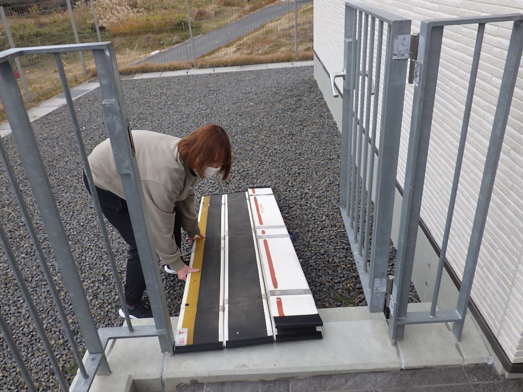 スロープを使って外に脱出する際、折り畳みのスロープを広げて設置する必要があります。