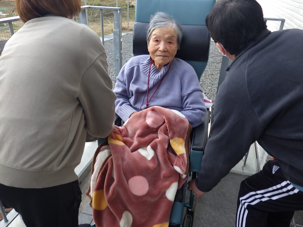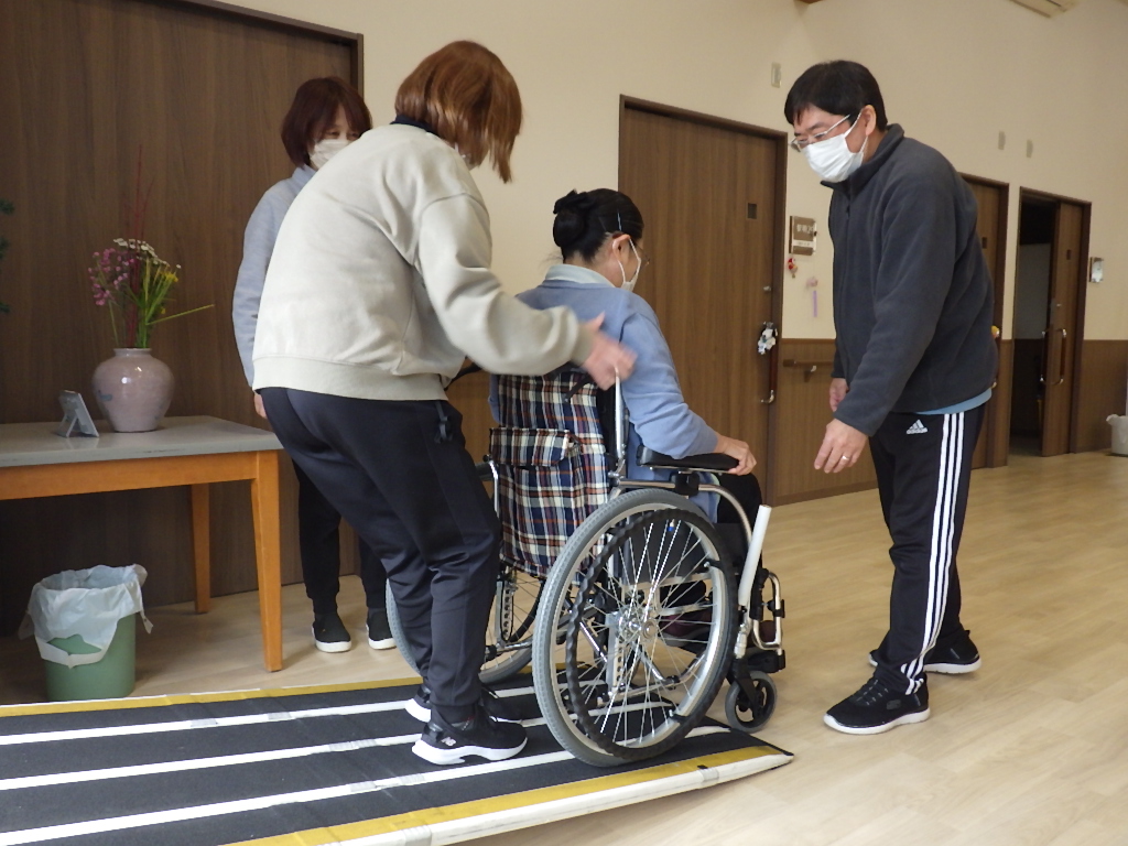 職員一人で持ち上げ広げ、車椅子を引いて外に出る流れを確認しました。