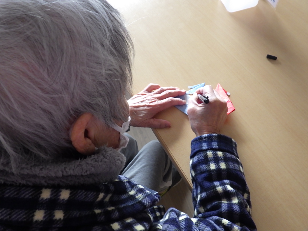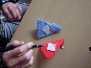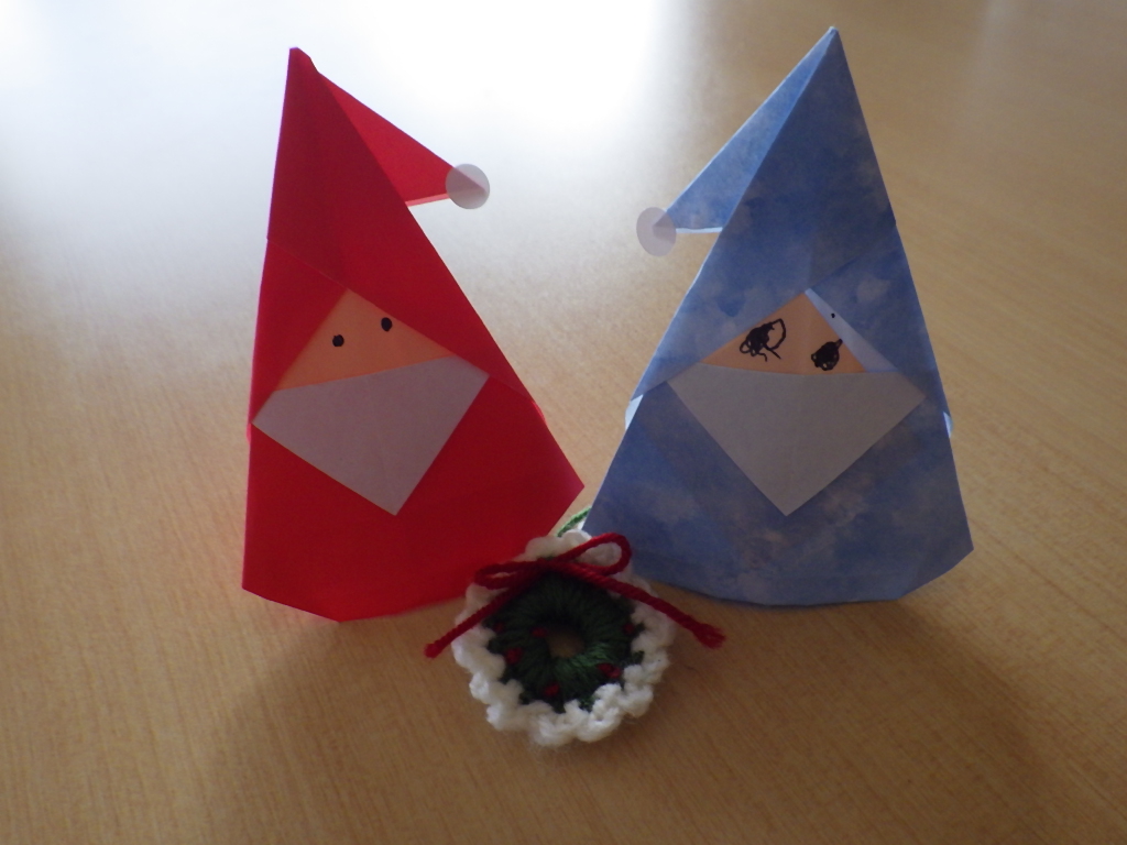 折紙でサンタクロースを作り、利用者様に顔を書いてもらいました