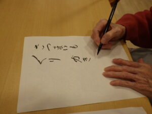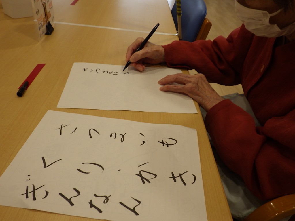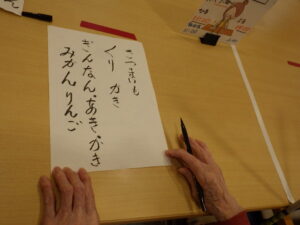 習字の好きな入所者様が、筆ペンで秋に採れるものを書いていみえました。何が好きかなと聞くとさつま芋と言われました。字を書くことは脳の活性化になりますね。これからも時間を作って書いて頂きたいですね。